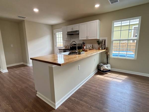 🍳 Stylish open kitchen w/ butcher block counters, subway tile & new range