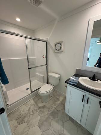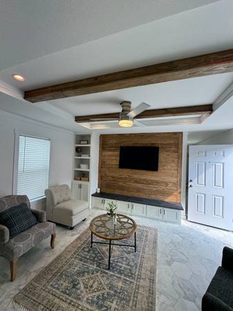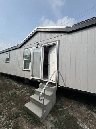 3 bed 2 bath, 16x76, full tape and textured walls, metal roof, big shower and closets, beam and tray ceiling with nice entertainment center, farm sink, etc.