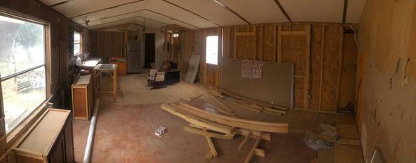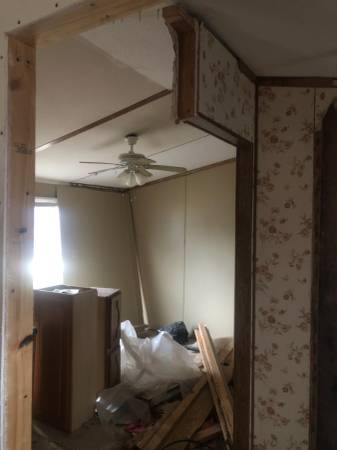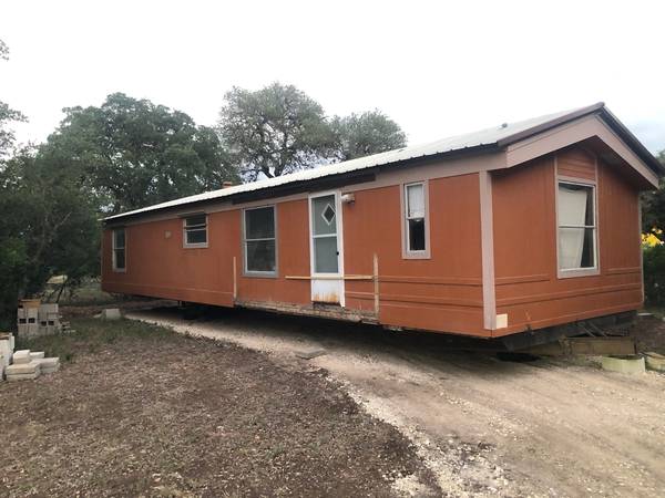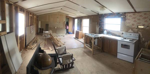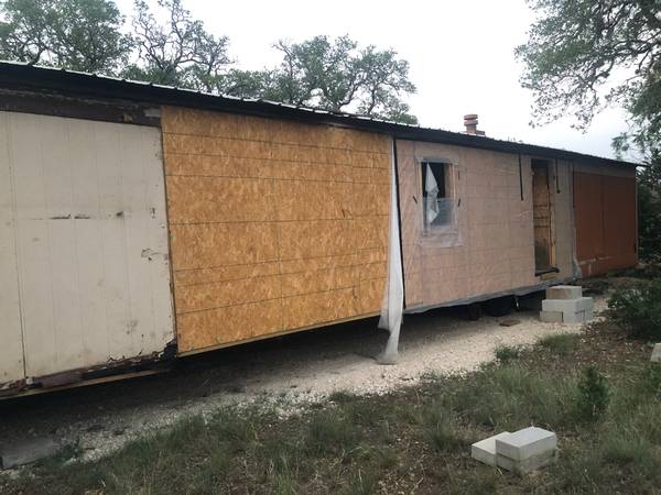 Fixer Upper. Really sturdy bones, walls, metal roofing and floor. Interior remodel project with backside siding needing to be done. Hot water tank and several other appliances like fridge and stove. Has some material like sheetrock/plywood maybe able to use in it. The porches and utilities have already been removed. Axle in place and hitch welded in place. Ready for truck to hook on and go. Will need to bring spare tires. There is a clear path to the road for driver clearance.