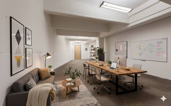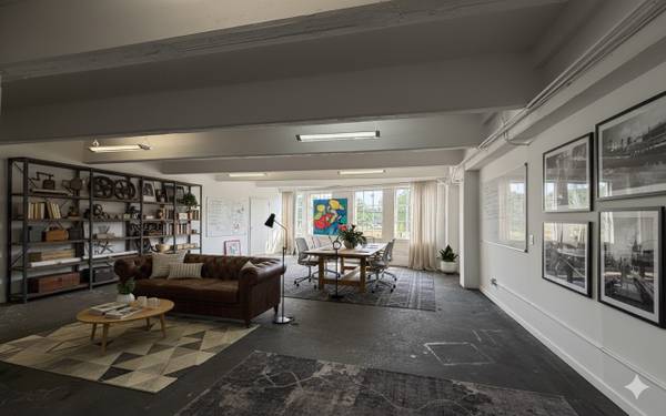 Space is very early Soho, New York with concrete floor, steel framed windows and brick walls.