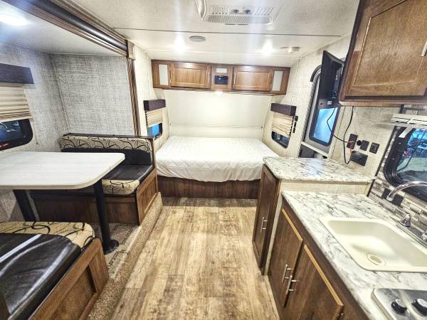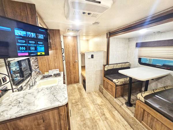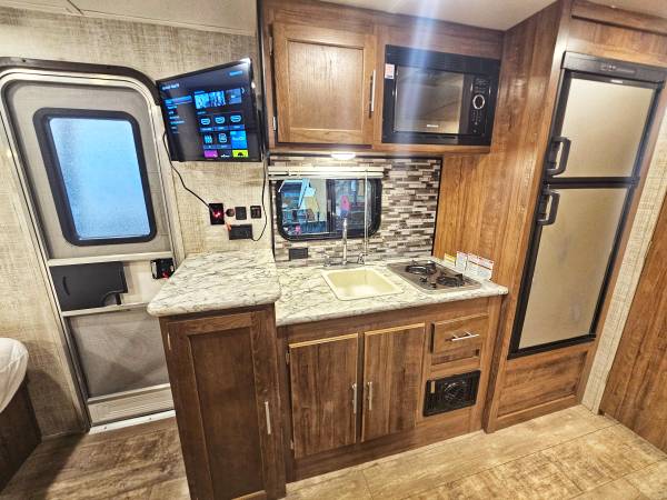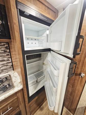 The kitchen and restroom with bonafide onboard waste tanks is a nice addition when camping. The full size RV fridge is a nice step up from the smaller under cabinet fridges. It is also cold enough to keep perishables.