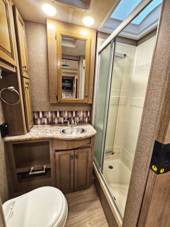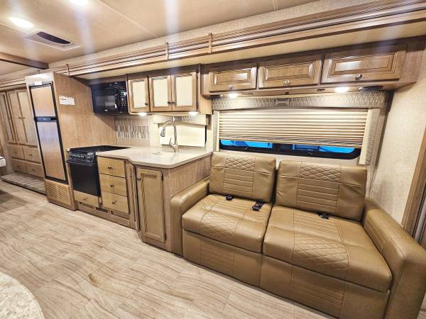 The front captain's chair's rotate around to become part of the living area. Above the cockpit, the electric magic bed lowers offering a queen sleeper.