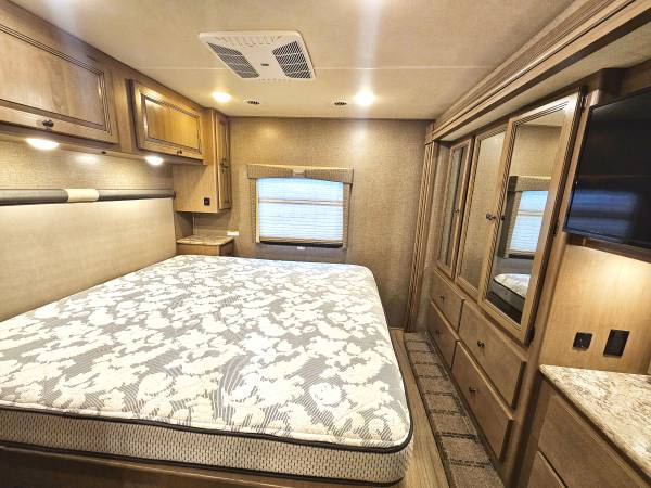 The private rear master bedroom includes an island style walk around RV king with plenty of storage all around.