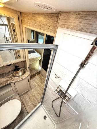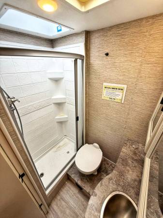 > Full Bathroom – Step-in shower with skylight, foot-flush toilet, vanity, and medicine cabinet.