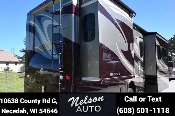 2014 Itasca Sunova 33C motorhome is set up with a nice hard-to-find layout. Set up with 3 living slides, 1 is in the front and 1 in the back bedroom. Giving you plenty of space all throughout the motorhome. Ford Chassis with the Triton V10 & heavy-duty automatic 5-speed transmission. The tires are in good shape, and the decal and fiberglass body are in good shape. Outside, there is a large auto patio awning and outside entertainment. Set up to sleep up to 6 with a dinette sleeper, bunk over the driver area, and RV Queen in the rear.
