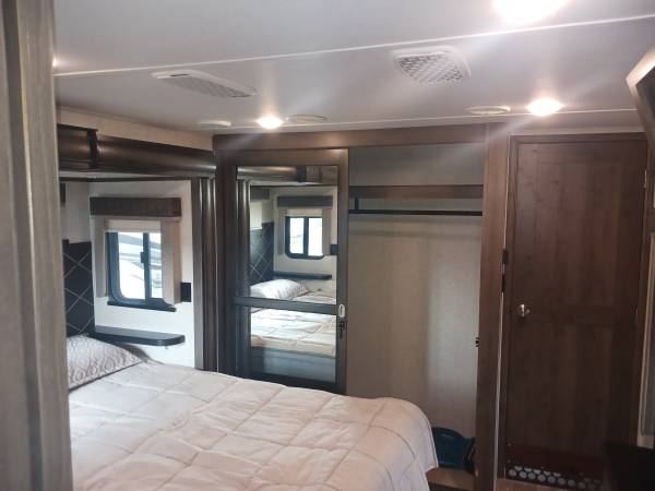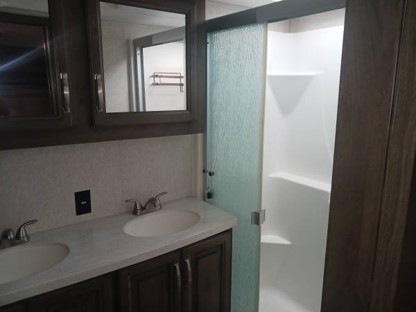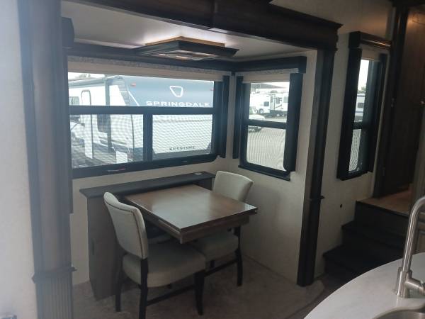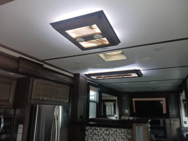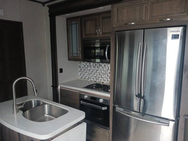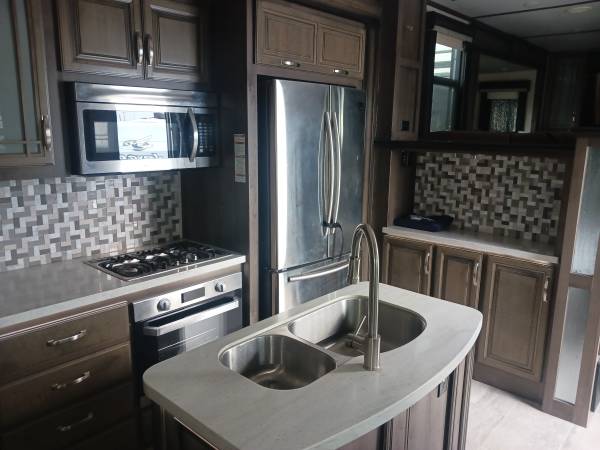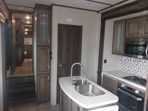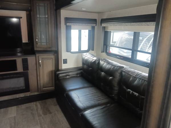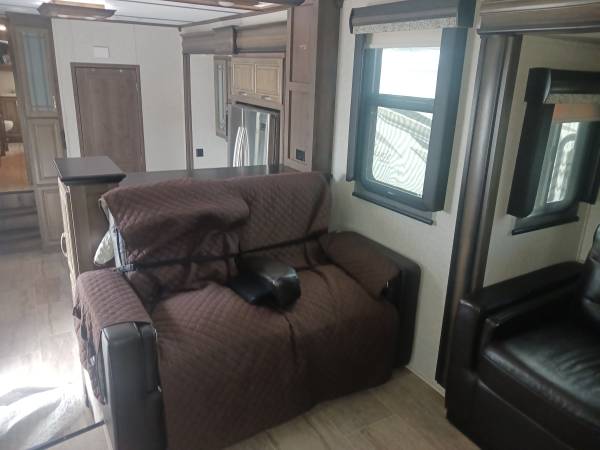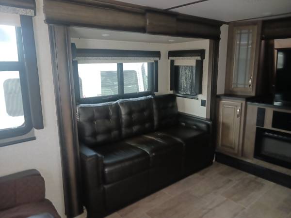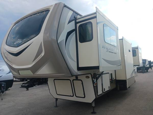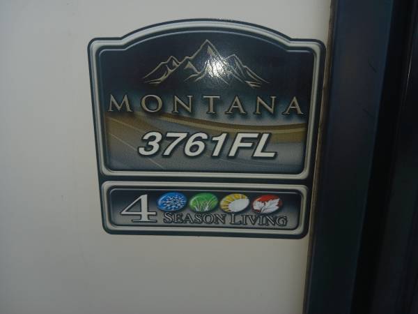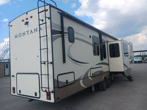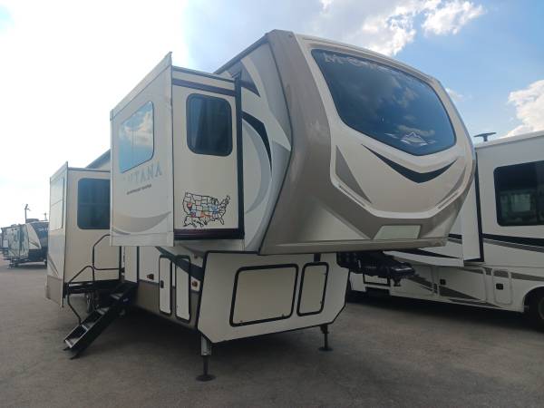 2019 Montana 5th wheel model 3761FL, very nice condition, all major appliances guaranteed to be good, this is a big front living room with five slides, up front you have two couches that both make beds and theater seats that face a 50 inch tv and fireplace, kitchen has a residential fridge, lots of counter and cabinet space, big pantry, and a half bath, bedroom has a king size bed in a slide, huge closets that are prepped for a stackable washer dryer, oversized front bathroom with sit-down shower and lots of countertop space and cabinets, this one has a huge outside underbelly storage compartment up front and in the rear, 50 amp service with two quiet cool air conditioners, gel coat fiberglass exterior, frameless windows, power awning, 6 point auto level, outside shower, black tank flush, and more, this is a great full-time unit, Montana has been the number one selling fifth wheel in the industry for over 20 years, we are a Montana dealer here and have been for over 15 years, this one on sale $49,900, more pictures and information upon request, we welcome trades and offers, call or text Joe for your best deal, 830-660-7074, please call for information on other used and new units we have here on the lot thanks. JUST LOWERED THE PRICE!!