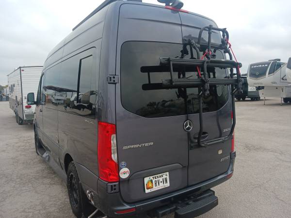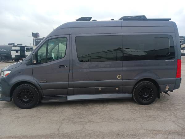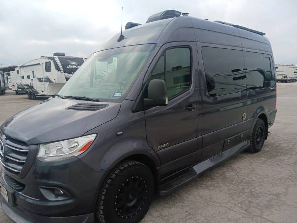 2021 class B diesel motorhome, American Coach Patriot, model SD144, all major appliances guaranteed to be good, one owner, hardly used, only 10,500 MI, six cylinder Mercedes-Benz engine, with a 7-speed transmission, four-wheel drive, rear and side view cameras, 5,000 lb tow hitch, diesel generator that runs off of the fuel tank with less than 10 hours, black, gray, and fresh water tank, rear power double bed, with TV already installed, big double door side bathroom, solar panel, conduction stove top, two touch screen panels, these units normally get between 18 and 20 mpg, beautiful unit inside and out, on sale $115,811, more pictures and information upon request, we welcome trades and offers, call or text Joe for your BEST deal, 830-660-7074, please call for information on other used and new units we have on the lot thanks.