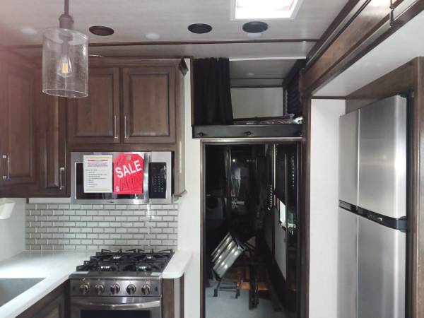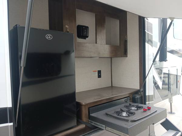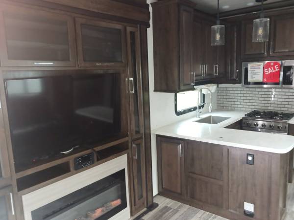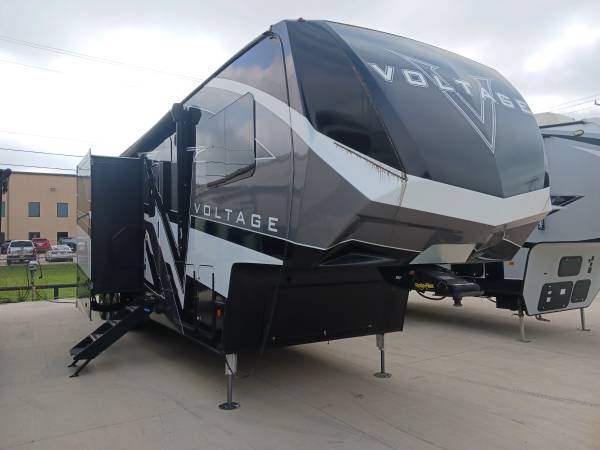 2021 Dutchman Voltage toy hauler fifth wheel, model 4145, good condition, three slides ,one and a half bath, two living room slides with recliner couch, 50" TV and fireplace ,lots of counter space with a four-door refrigerator ,side bath with sit down shower, good storage , front Queen walk around bed with a closet slide, two ducted air conditioners, outside kitchen ,auto level ,garage area sleeps 4 easy with ceiling bed and two couches, half bath, this one has three axles on aluminum wheels auto level two awnings and a 5500 watt Onan generator ,on sale $66,888, more pictures and information upon request, we welcome trades and offers, call or text Joe for your BEST deal, 830-660-7074, please call for information on other used and new units we have on the lot thanks. JUST LOWERED THE PRICE!!!