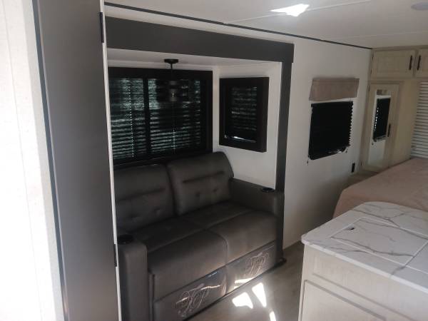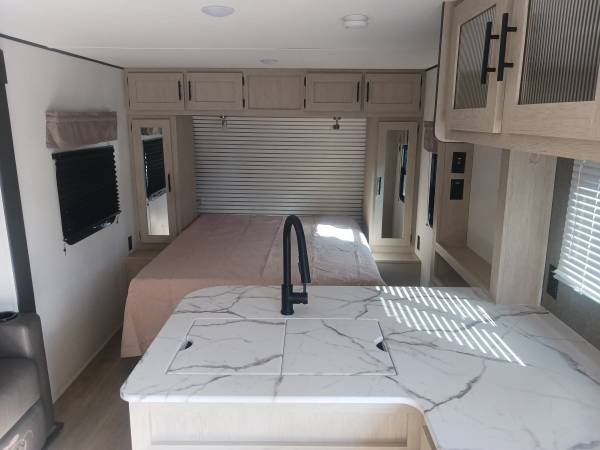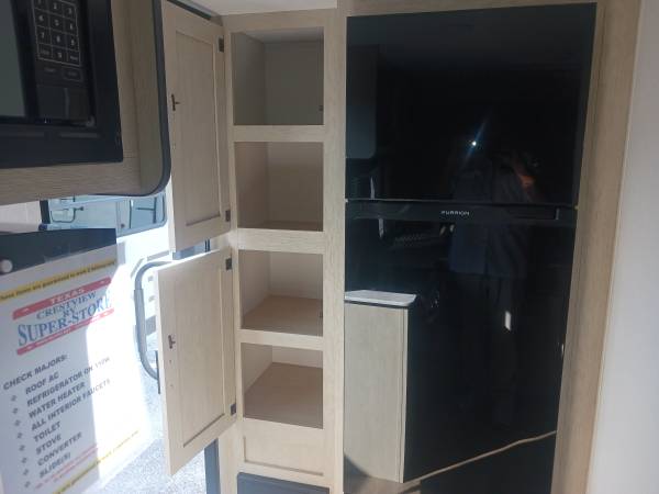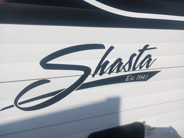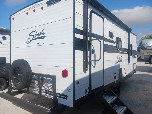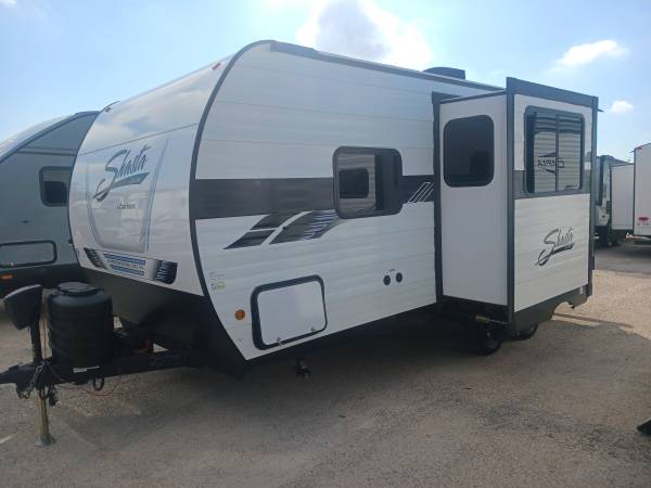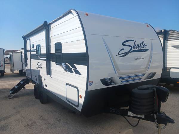 2025 Shasta travel trailer model 20RB, super nice and clean, this one looks absolutely perfect condition, no evidence that it's ever even been used, this one has hide a bit couch in a slide that faces the TV location, front Queen walk around bed with great storage and closet space, side kitchen with composite countertops and great storage, big 10 cubic foot 12 volt refrigerator, roof air conditioner, huge pantry, rear bath with stand up shower, no carpet anywhere, power awning power tongue jack, on demand water heater, outside shower, black tank blush, cargo rack, and new spare tire, extra large front cross through storage, this unit is absolutely perfect, pristine, inside and out, all major appliances guaranteed to be working properly, walk through and make ready included, on sale $21,900, we welcome trades and offers, call Joe for your BEST deal, 830-660-7074, please call for information on other used and new units that we have on the lot thanks.
