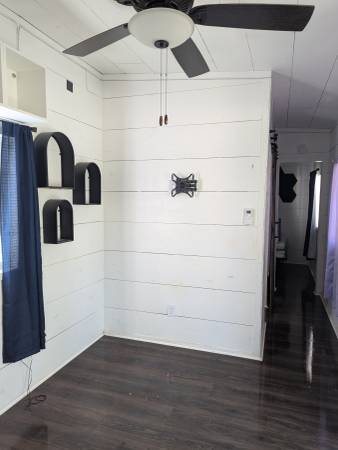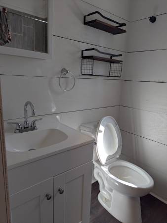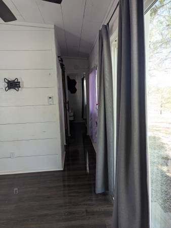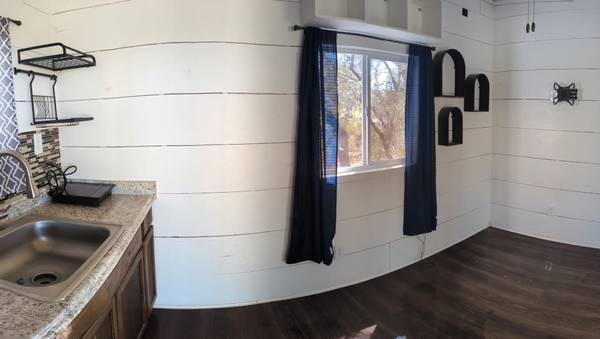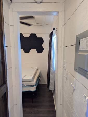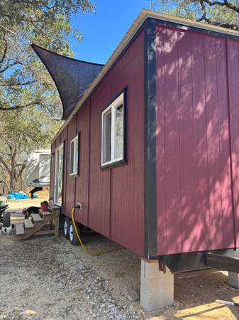 8ft wide by 28 feet long, Built in 2023 on a RV camper frame. Had new tires when purchased, pulled less than 10 miles from place of purchase to where it sits today. Built using residential 16” on center 2x4’s and residential style insulation in the ceiling and walls making this a very heavy and solid tiny home. Has tough metal roof, no water leaks, and solid floors. Mini split heat pump for A/C and Heating. Wired for 50 amp service, tankless water heater. Waste water plumbing is separated for black water and grey water. Price includes the mini fridge, 1 portable induction electric stove top, the shelving as seen in pics, kitchen racks, foundation bricks, steps, septic hoses, and heated water hose.The RV trailer hitch requires a 2 & 5/16th trailer ball, would required a larger truck to pull it.