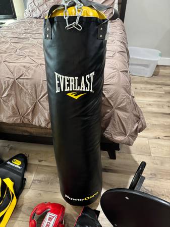 Heavy bag 100lb, speed bag w/wall rack, 2 head gear, sparring gloves.