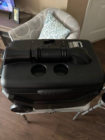 38 qt ice chest almpst yeti quality. Fill it with ice and turn it on the heat exchanger, and you have an air conditioner. It also has a misting feature. Runs on a/c, 12v DC, or battery. Complete in the box and 12v car cord included. This is brand new in the box. Use it as a cooler and a portable air conditioner. These retail at over $500 .