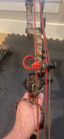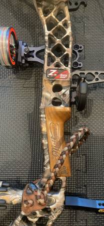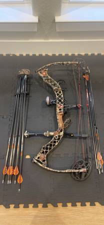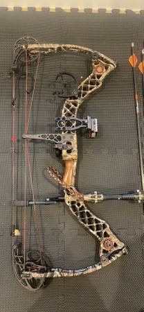 Used - well maintained Mathews Z7 compound bow. Draw length = 28.5, weight of draw ~ 60lb. Comes with 5 good Easton hunting arrows with light up knocks, and mega meat expandle broad heads, 4 training arrows with mega meat training heads. Wrist trigger release, black hard case, quiver. Sight, stableizer come with bow.