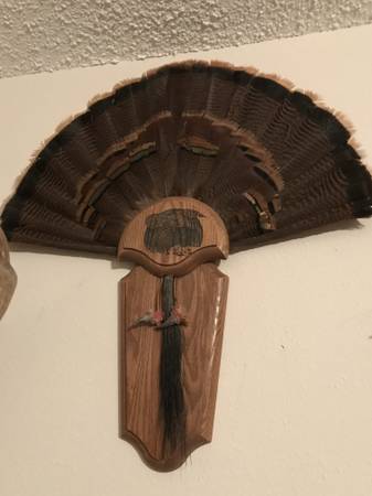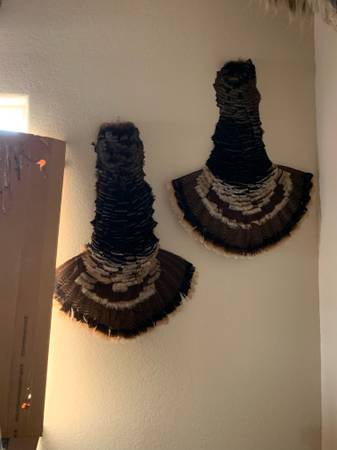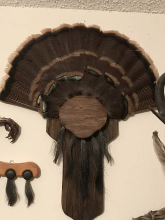 Large turkey feather mount with beard - $150 - Pic 1 Turkey feather mounts - $100 each or $190 for both - Pic 2 Multi turkey beards and feather mount - $125 - Pic 3 Turkey beard, spurs and feather...