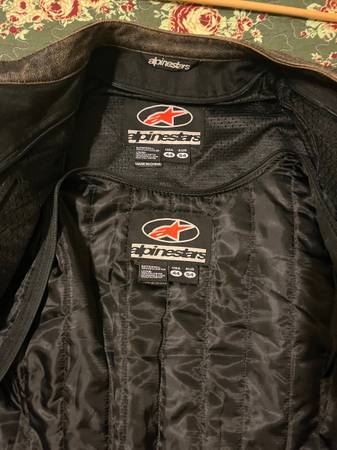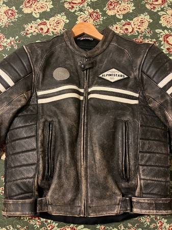 Like new leather Alpinestars MC jacket. In mint condition. No issues whatsoever, just going in a different direction with color and style. This jacket has a great vintage patina. No tears, scuffs, stains. Comes from a clean, non-smoking household. Zip out liner, adjustable waist, zippered pockets throughout. Armor and reinforced in the right places. Size 44. I’m 5’10” and in the 180 lb range. Fits me fine.