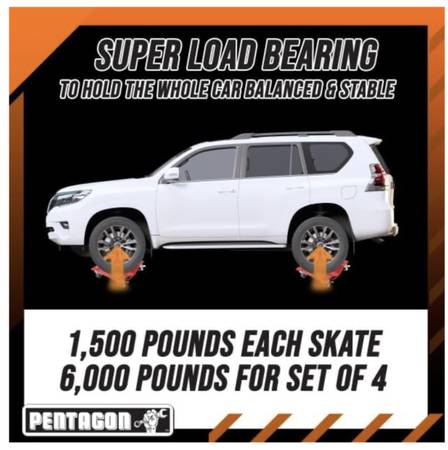 • MULTIPURPOSE CAR DOLLY SET OF 4 - The 16x12" car mover wheel dolly 4-pack offers a total 6,000lb capacity (1,500lbs per skate) for moving cars, trucks, trailers, tractors, ATVs, motorcycles, lawnmowers, or furniture, with a drilled hole for easy storage.