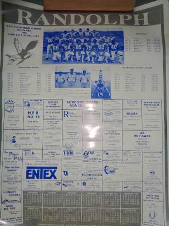 $5. A real blast from the past 1980. R.A.F.B. high school Ro-Hawks 1980 Football schedule poster. Perfect condition.