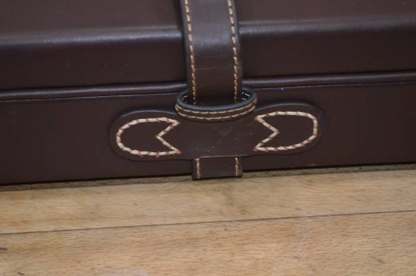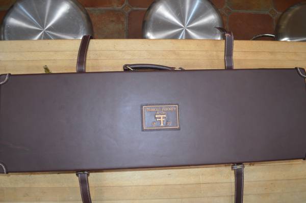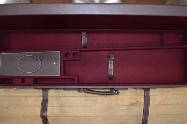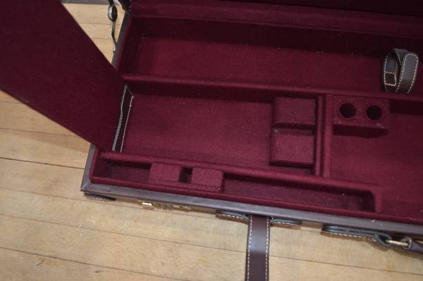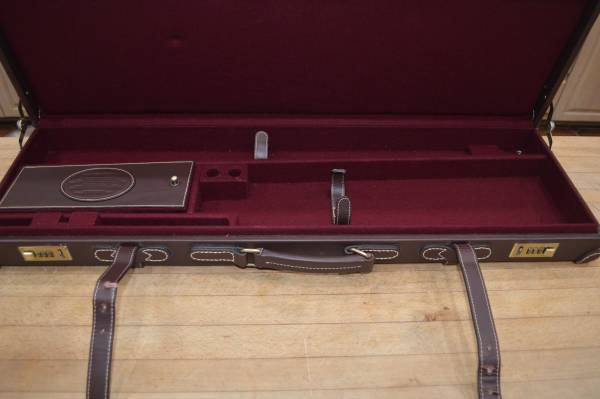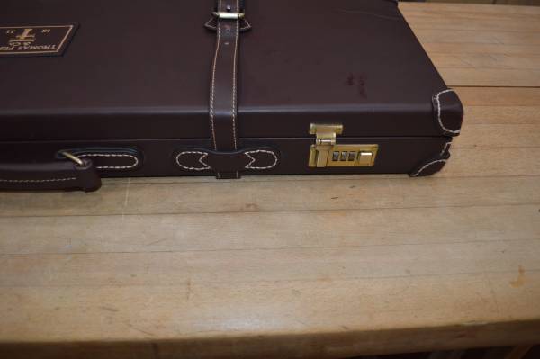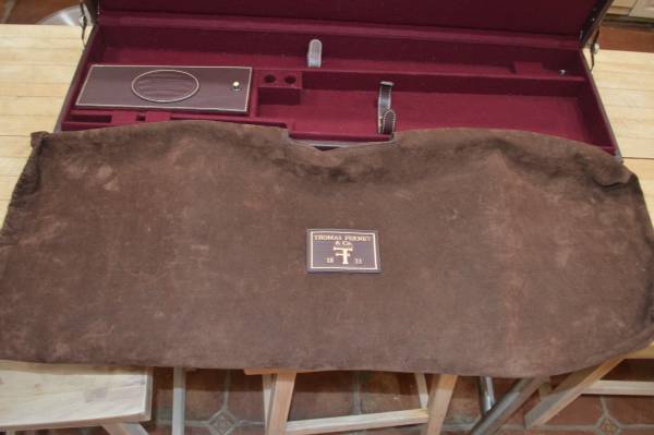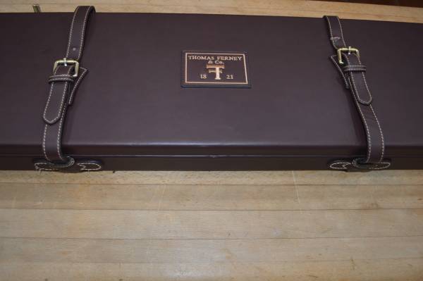 THOMAS FERNEY AND SONS 1821 O/U LEATHER SHOTGUN CASE.FOR 32" BARRELS AND UP TO A 21 1/2" STOCK COMES WITH SUEDE LIKE COVER BAG. CASE HAS COMBINATION LOCK, GOOD TO EXCELLENT CASE WITH ONE PROBLEM ONE LATCH IS BROKEN, BUT CASE HAS STRAPS SO NO FEAR OF IT OPENING ACCIDENTLY IF STRAPS ARE SECURED. TS