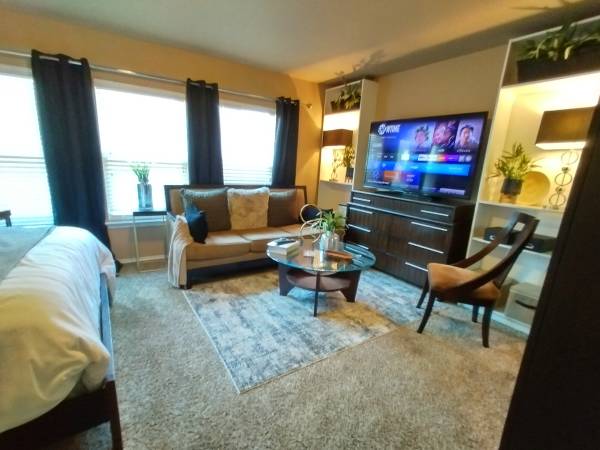 Queen Bed, Dresser, Large 55 inch TV ,(Own Living/Sitting) Sofa office Desk, Chair, Side Table, Lamp, Mini Fridge, Microwave
