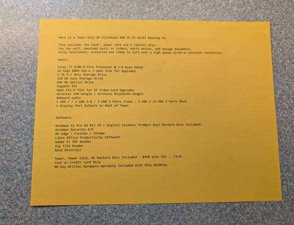 Tower, Power Cord, OS Restore Disc Included - $450 plus tax . Firm.