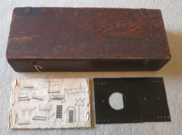 Early 1927 complete Gilbert Erector set model #7 1/2 with wooden box which has been inventoried. Inventory sheets accompany the set. This set includes the complete "white truck" model. The truck parts have "white truck" stamped on the fenders, but Alfred Gilbert painted them black anyway. The white rubber tires are original but are hardened. The instruction manual has all the pages but has no cover and is in poor condition. Original 6-8 volt motor with brush contacts in good condition, but not running. A later model electrical motor will be added to the set. The parts boxes are new. The box is in good condition.