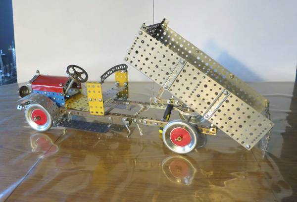 A. C. Gilbert Erector set toy; the Dump Truck constructed with parts from the 1950's A. C. Gilbert Erector Set 10 1/2, and measures about 24" long. The front chassis and steering column work.