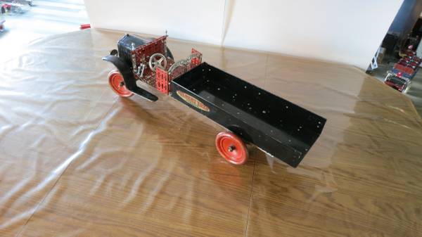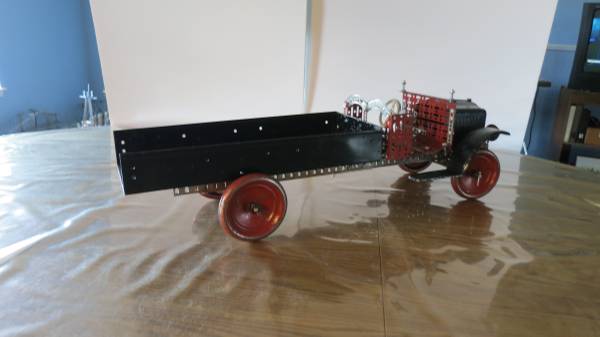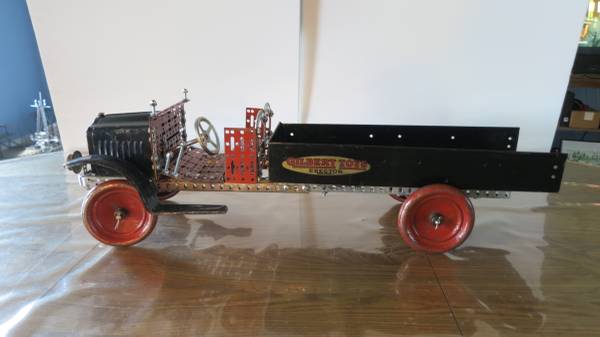 A. C. Gilbert Erector set toy; the 1929 White Truck was constructed with parts taken from the late 1920's wooden box set #7 1/2. The truck is 26" long and the front chassis and steering column work. The truck got its nick name "White Truck" because the hood and fenders are embossed with the word "White", but Gilbert painted the truck black anyway.