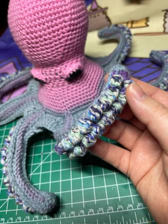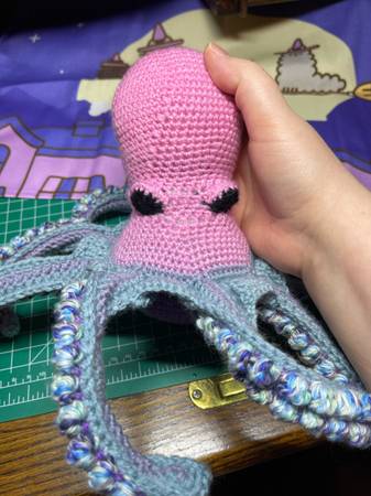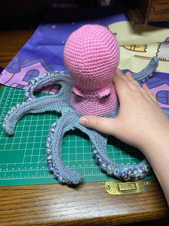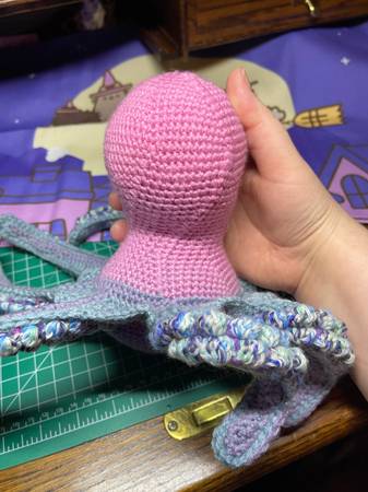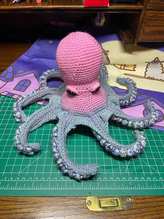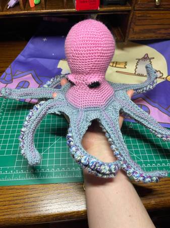 A pink, purple, and blue octopus stuffed animal NOT appropriate toy for pets or small children These are all handmade by me, so they will all turn out a little bit unique. The patterns are also my...