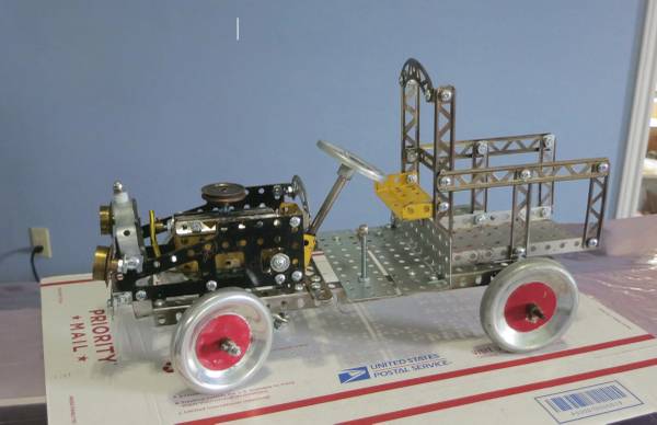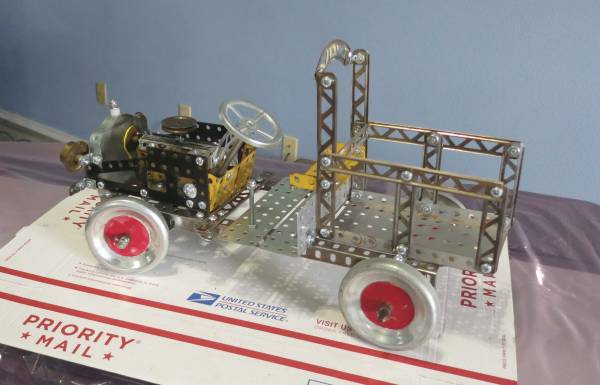 A. C. Gilbert Erector set toy; the Wheat and Grain Truck constructed with parts from the 1950's and measures about 15" long. The front chassis and steering column work.