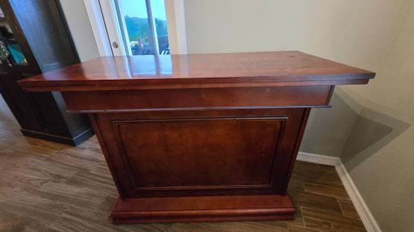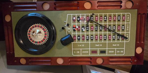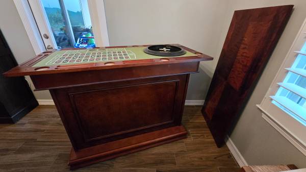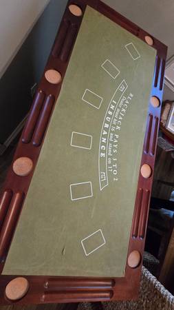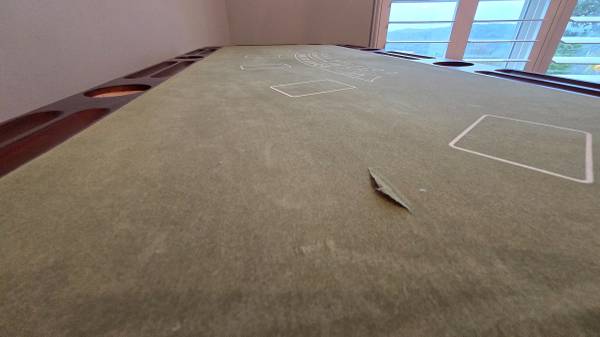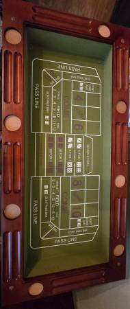 4 in 1 Casino Table. Converts into three different game tables. Area for storing and making drinks. Gently used with small tear. Comes with dice, Roulette Wheel, balls, and dice cup. Sold as is....