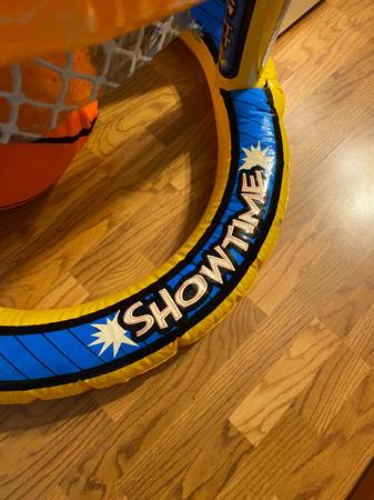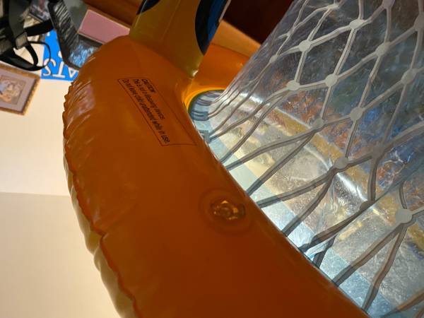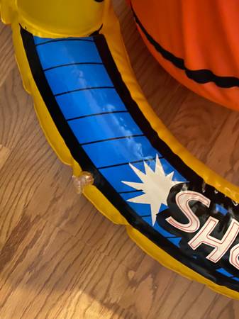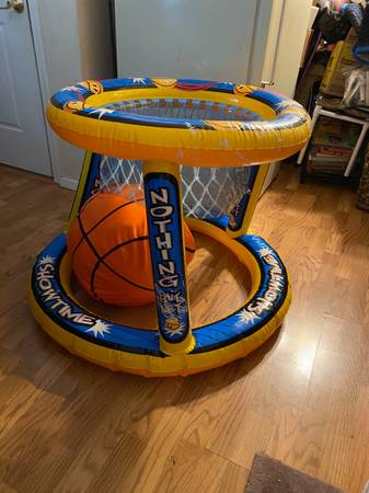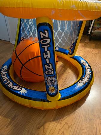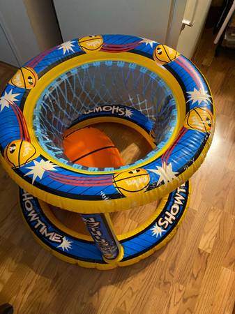 Big basketball beach/pool hoop with balloon ball, great for the pool, 40" in diameter on the bottom, 31" on the top, it inflates separately top ring and bottom ring, asking $40.