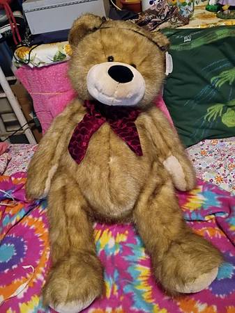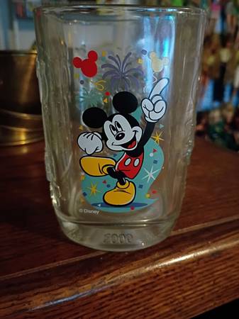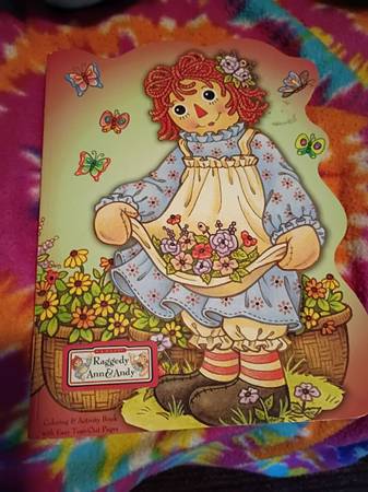 Large plush bear$20, Mickey mouse Walt Disney 2000 glass $10, Raggedy Ann color book $3