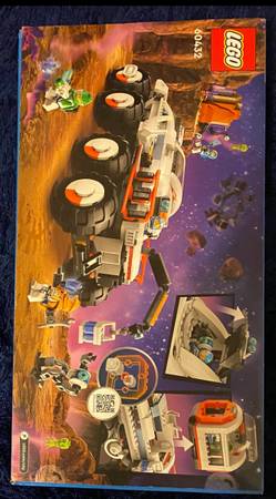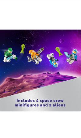 What’s in this space exploration playset? – An 8-wheeled rover vehicle, a planet scene with plants and a toy crystal, 4 space crew minifigures, a space robot, and 2 alien action figures
