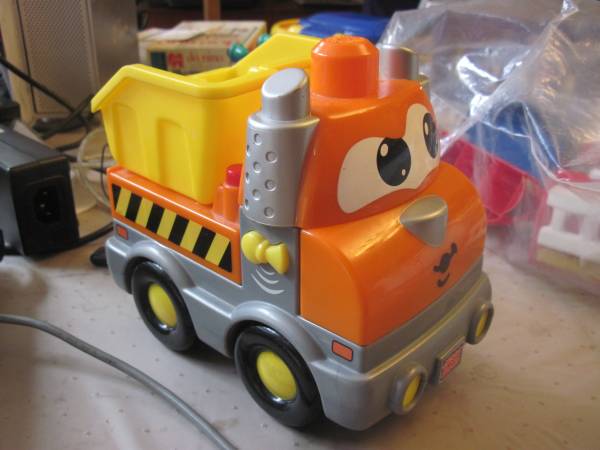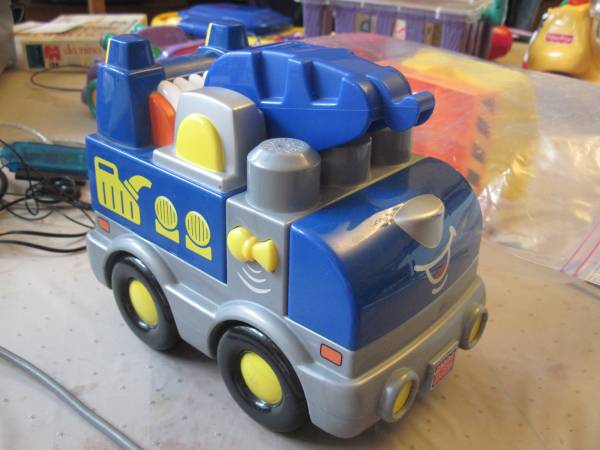 Mega blocks, 8 pcs, make 3 different trucks, makes a sound, requires 3 AA batteries.