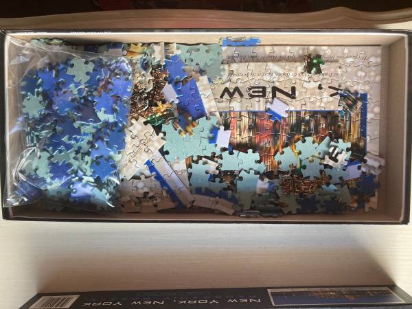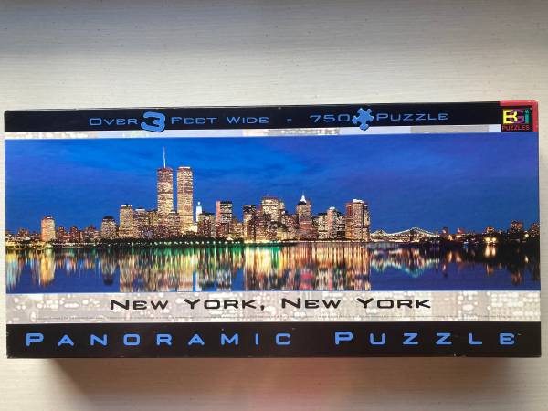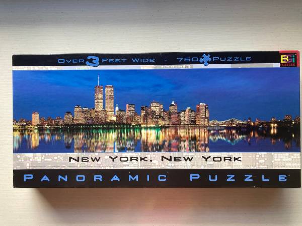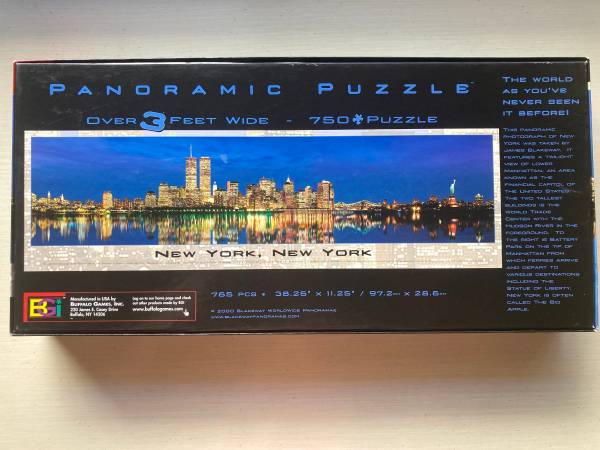 $10. Perfect condition, no missing pieces. made in USA. 750 pieces. measures 38.25" x 11.25". We 'conquered it once'.. very challenging, but well worth it. We left some pieces in place to get you...