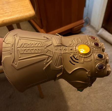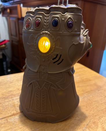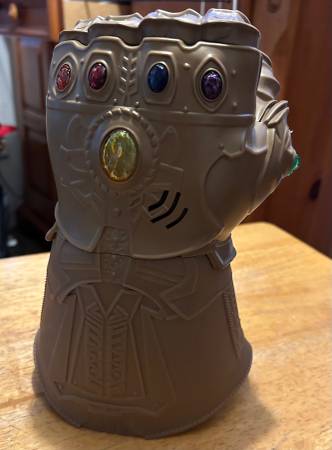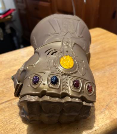 Thanos infinity gauntlet It has sound effects and the center stone lights up and it has a handle on the inside.