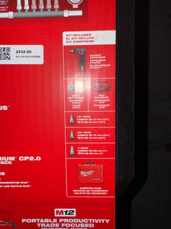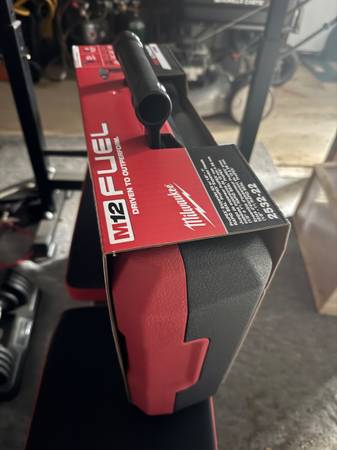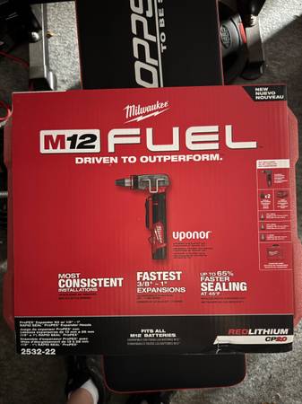 BRAND NEW IN BOX!!! Milwaukee M12 Fuel Uponor tool, It comes with Two 12V batteries, charge, Uponor tool, 1/2”,3/4” and 1” heads, and carrying case. This goes for $499.00 plus tax at Home Depot.