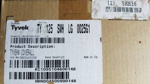 Dupont Tyvek Coveralls P#TY-125 size Large, Case of 25, new in unopened box. Tyvek 400 fabric offers an inherent barrier against particles. Applications for use include: mechanical repairs, general maintenance operations, spray painting, general clean-up, lead and asbestos abatement and remediation.