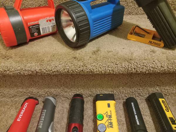 Most are D battery .. large flashlights take (4) D batteries .. All lights for $18 .. Cash only .. Located by Exxon Higgins Rd 78217 (see red dot on map)