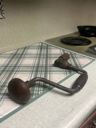 Antique hand drill with wooden handles. Delivery available depending on location for small fee located near bitters and 281.