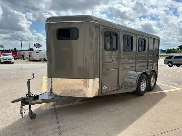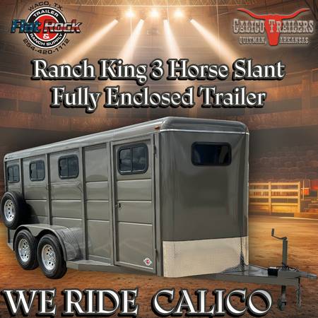 Year: 2025 Make: Calico Color: AZ Beige Stock: CA771 Price: $14,999 Calico 3 Horse Slant Trailer - Ranch King Package Fully Enclosed-Drop Down Windows-Rubber Floor Mats - 17' x 6' (Width) x 6' 6 in...