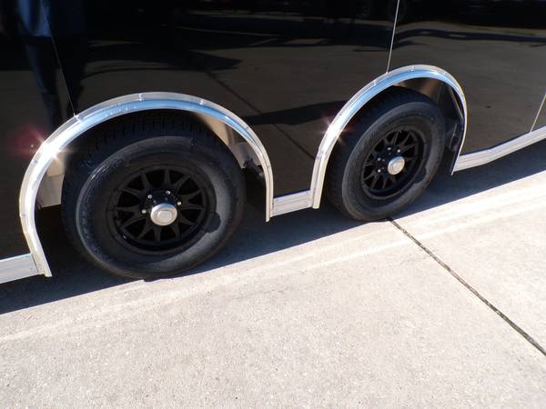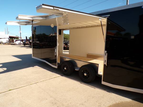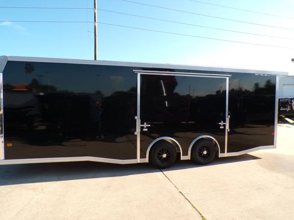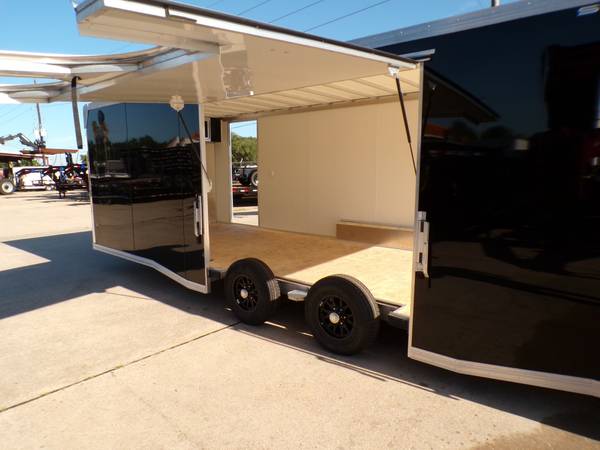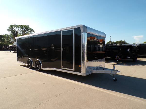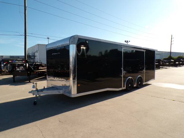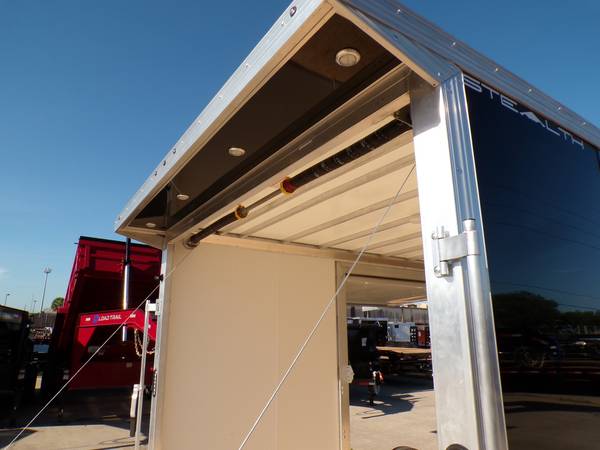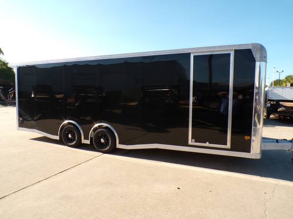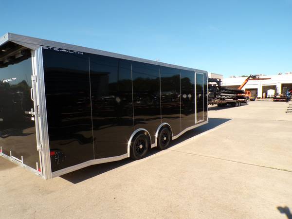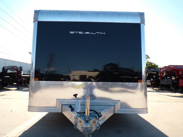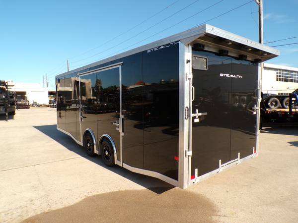 New Stealth By Alcom STEALTH 8.5X24 CAR HAULER** INTEGRATED FRAME **** FLAT FRONT W/ CAST CORNERS16" O/C Walls, Roof & Floor Studs2"x6" Subtube Framing.030 Screwless Skin, Bonded on SeamsOne Piece Aluminum RoofBox Length: 24'Box Width: 99" Interior Height: 82"Rear Door Opening: 80"Axles: 2-5k Braked Leaf Spring Axles, 4" Drop24" StoneguardTires: Part # 60-00000074, 15" Gloss Black Mod, ST225/75R152 5/16" CouplerGVW: 9990#(2) Dome Lights w/Wall SwitchCar Hauler Grade Rear Ramp w/Spring Assist, Starter Flap & Aluminum Hardware Beavertail Construction5000# Center Jack3/4" Water Resistant DeckingWhite Vinyl Faced Luan WallsExterior LED LightingPlastic Salem Vents3" Exterior TrimInterior Cove Trim Package(4) HD D-Rings32"x72" Side Access Door w/ Paddle Handle & Piano Hinge(2) Safety Chains4-Year Limited WarrantySIDE DOOR: CURBSIDE FRONT 2' BACK FROM THE START OF THE BOXCOLOR: BLACK .078 POLY CORE SKIN Upgrade to 2-5k Torsion Braked Axles (From 2-5k Leaf Spring Braked) (Tandem axle trailers get center beam in tongue) Spread Axle Upgrade (w/Tapered Fender Skirting) Upgrade to PolyCOR Exterior .078 Sheeting Upgrade to Composite Translucent Roof 8' Flat Front 4 Door Overhead CabinetColor: BLACK Upgrade to 78"-Tall Side Access Door (From 72" (SAD) Upgrade to 15" 225 BLACK Aluminum Wheels Rear Door Canopy w/ Lights Custom Elite Escape Door...- 72" x 88-1/2" Fold Up Escape Door - w/ Gas Prop Lift Assist, - New Removable Fender Kit, - .030 Bonded Interior Finish- Aluminum Compression Latch System Upgrade to Larger 4" Top, Side & Bottom Trim