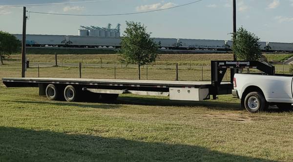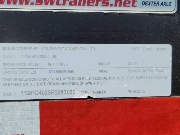 GOOSENECK FLATBED TRAILER, 2015 Southwest Gooseneck LTD., 102" X 40', GVWR 25,900. Dual 12K Dexter axles. Well maintained trailer with good deck condition (no wood rot). Storage box, chain locker, new straps, spare tire. Tires replaced 2023. 2nd Owner. Priced to sell $6,000. Located in Elmendorf. Phone calls only. DO NOT TEXT.