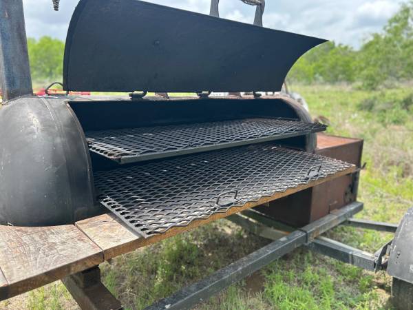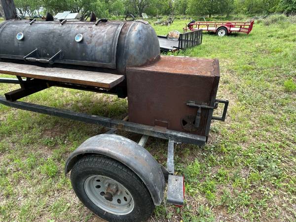 Heavy duty bbq trailer, pulls great, cooks good, pull out grills, great fire box flat for cooking tortillas beans or any pots and pans on top. Ideal for hunting camp. $6,000 obo Mesquite wood shelf....