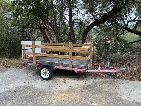 This utility trailer is small and has a single axle 🚚. Its frame is made of metal, painted a faded red or pink color 🎨. The trailer features a flatbed with a dark-colored wooden deck 🛠️ and tall, slatted wooden side rails 🌳.