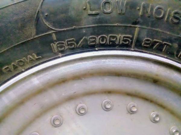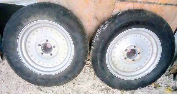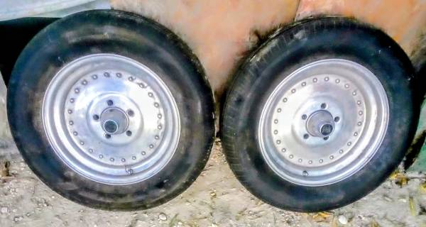 Pair. Good condition. Wheels fit 5 on 4½" Ford and Dodge vehicles. Tires are 165/80R15 and have zero road miles. Sold as shown. Price is firm. Cash only. No trades. Must pick up.
