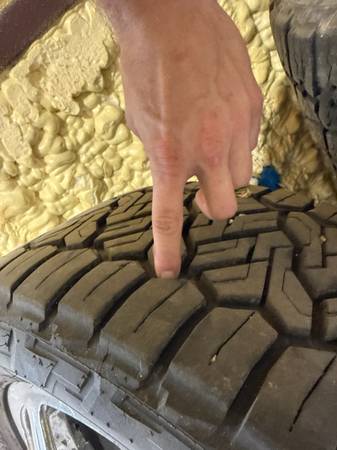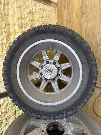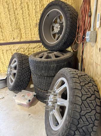 Front tires are brand new Rear tires have 50% LT285/55R22 Have spiked lugs 8x180 lug pattern 22” Mayhem rims