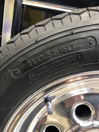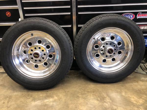 2 weld wheels 15x3.5 dual pattern 5x4.75& 5x4.5,wheels come with mickey Thompson tires and set are in real good condition also comes with center caps.wheels have washer imprint on 5x4.75 pattern...