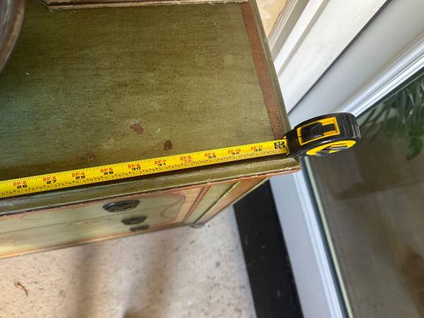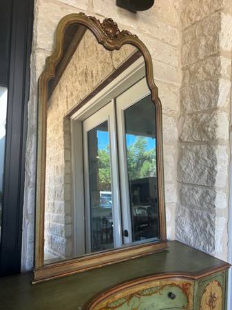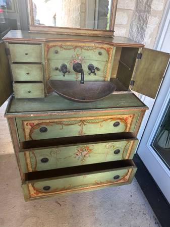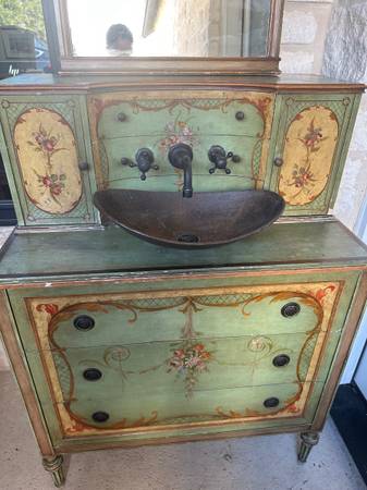 Antique dresser converted into a sink. There is a matching mirror that comes with it. The mirror has wire on the back to hang it from a wall. There is some paint chipping. Measurements are in the photos.