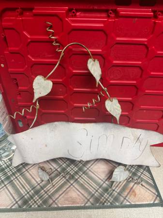 Metal sign with leaf design and 'Live Simply' text.. Located near bitters and